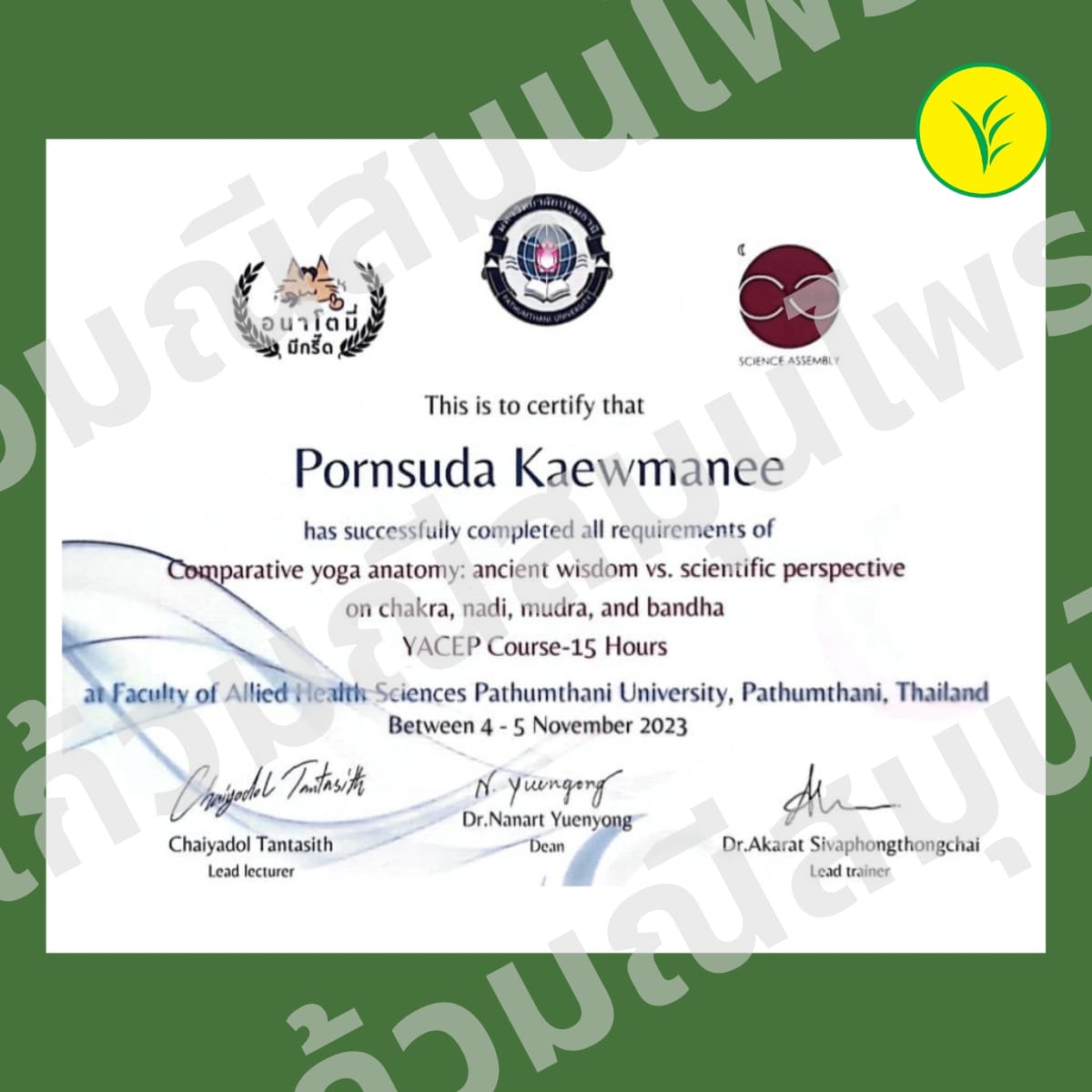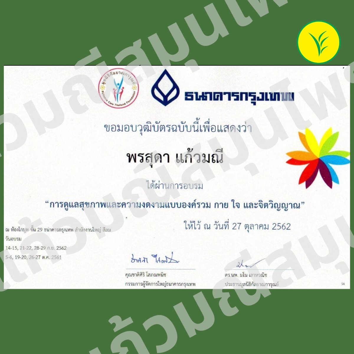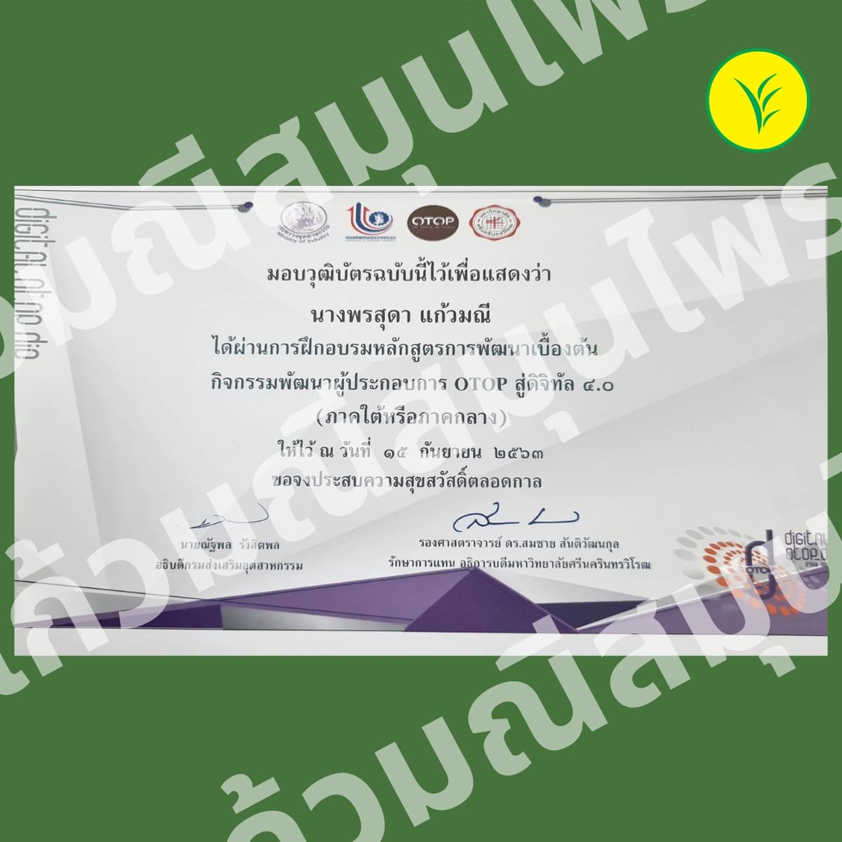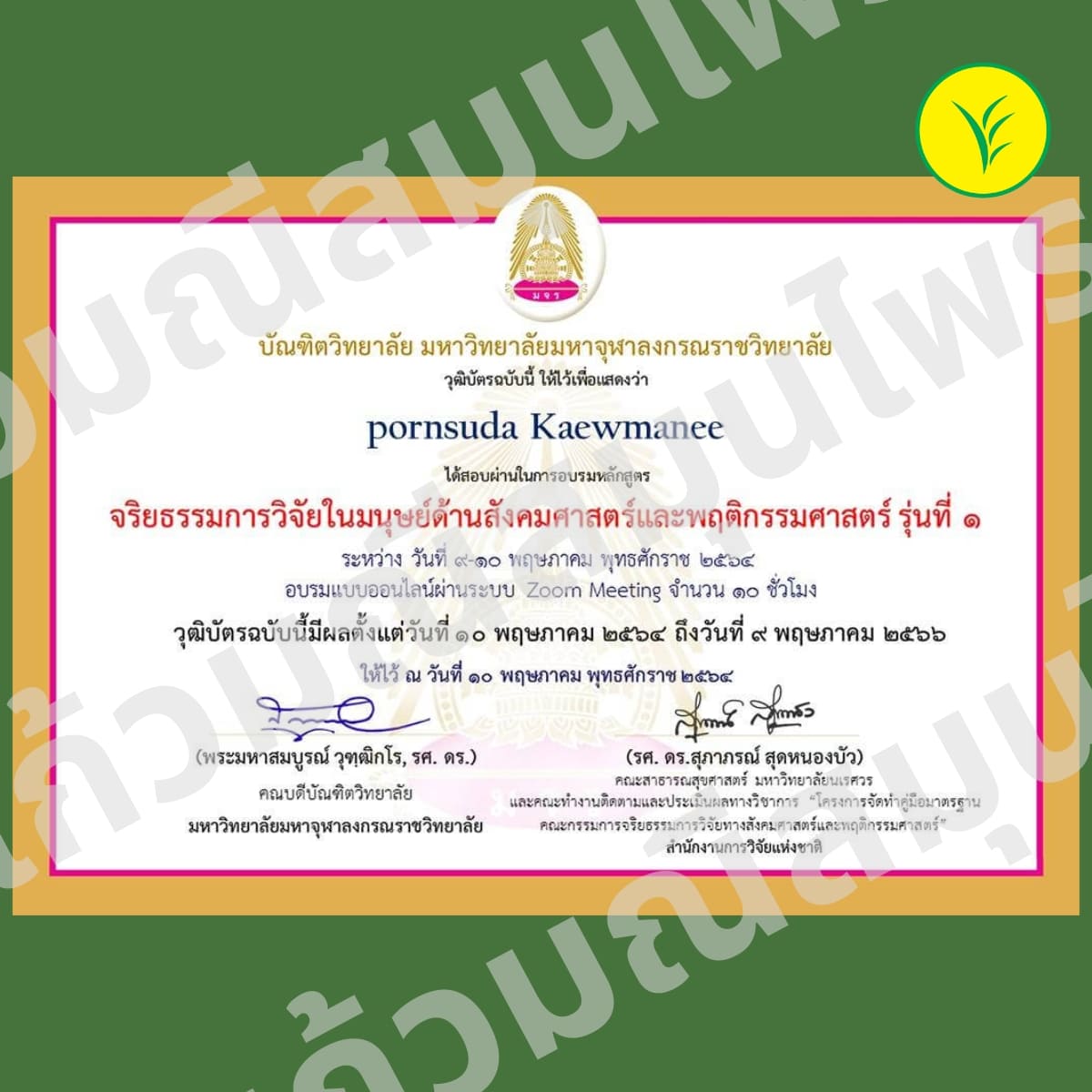 หมอแจง จากแก้วมณีสมุนไพร ผ่านการฝึกอบรมหลักสูตร จริยธรรมวิจัยในมนุษย์ด้านสังคมศาสตร์และพฤติกรรมศาตร์ รุ่นที่ 1 จาก บัณฑิตวิทยาลัย มหาวิทยาลัยจุฬาลงกรณราชวิทยาลัย เมื่อวันที่ 10 พฤษภาคม 2564