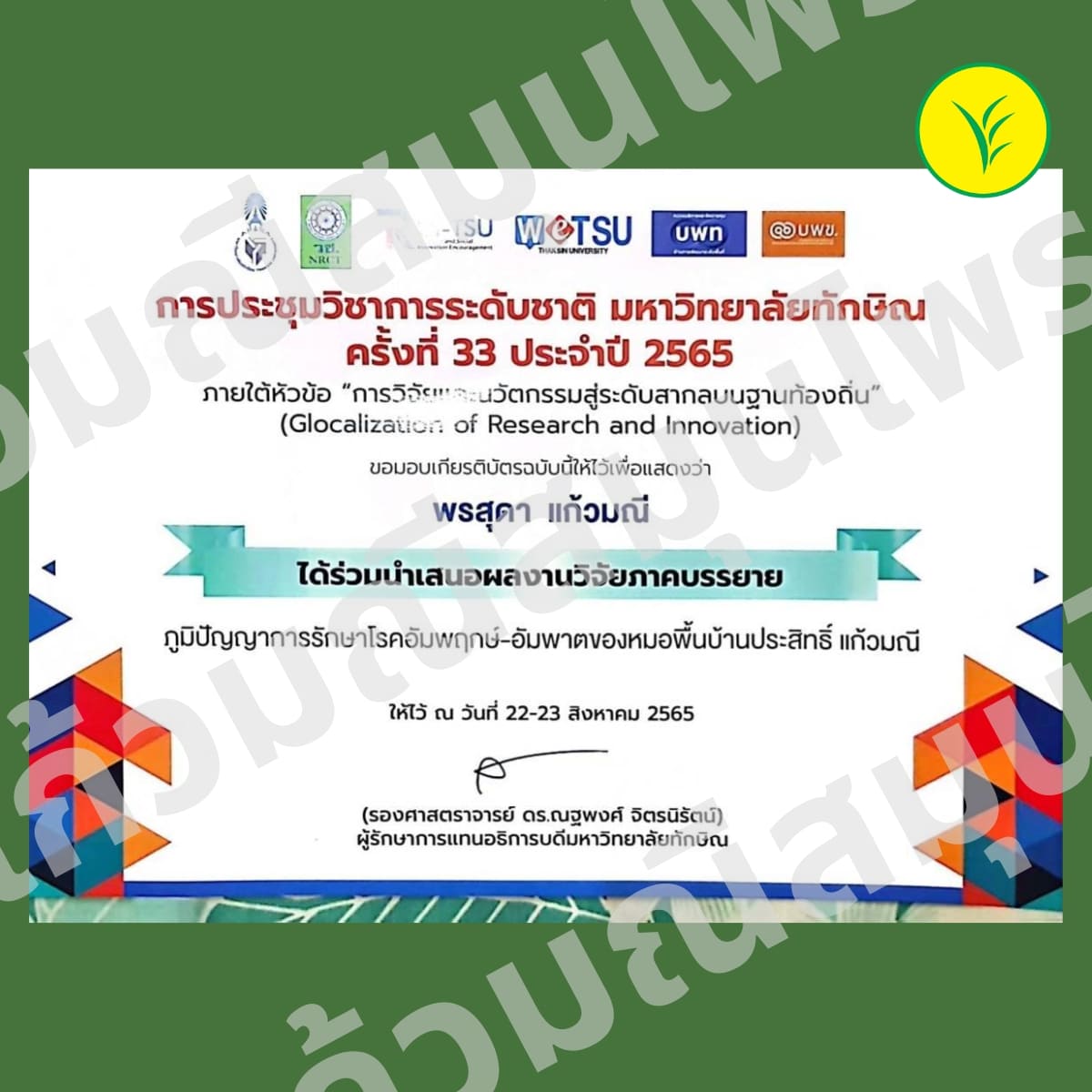 หมอแจง พรสุดา แก้วมณี จากแก้วมณีสมุนไพร ได้รับคัดเลือกให้นำเสนอ ผลงานวิจัยภาคบรรยายในการประชุมวิชาการระดับชาติ มหาวิทยาลัยทักษิณครั้งที่ 33 ประจำปี 2565 ในหัวข้อภูมิปัญญาการรักษาโรคอัมพฤกษ์-อัมพาต