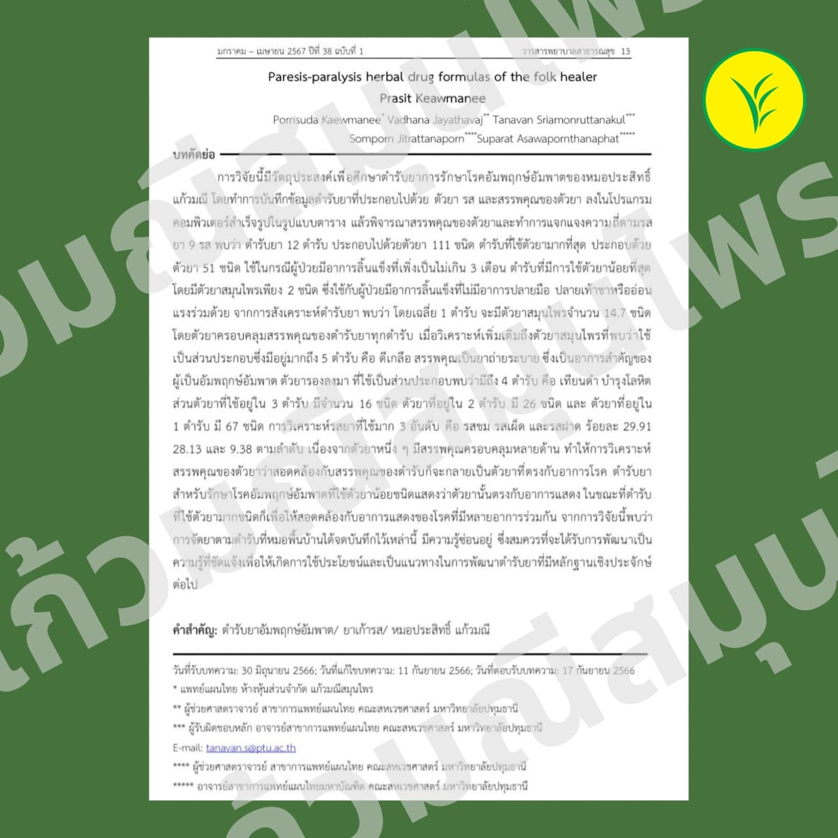 ผลงานวิจัยเรื่องตำรับยาแก้อัมพฤกษ์อัมพาตของหมอประสิทธิ์ แก้วมณี จากแก้วมณีสมุนไพร ได้รับการคัดเลือกให้ลงในวารสารพยาบาลสาธารณสุข มกราคม-เมษายน2567