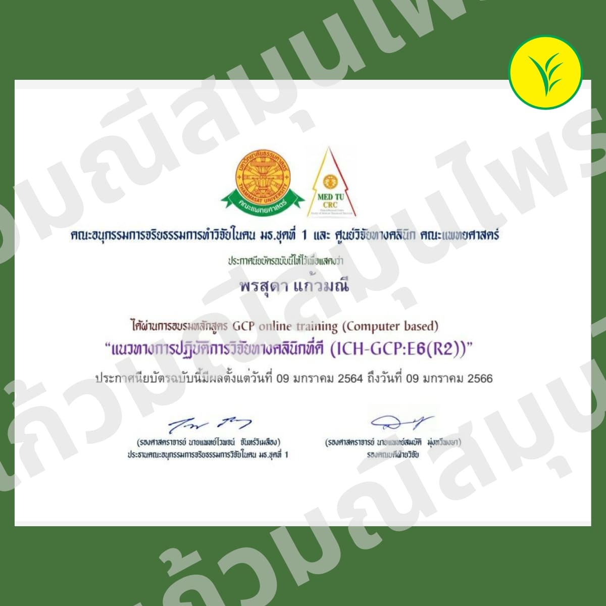 หมอแจง จากแก้วมณีสมุนไพร ผ่านการฝึกอบรม GCP Online Training หัวข้อ แนวทางการปฏิบัติการวิจัยทางคลีนิคที่ดี (ICH-GCP:EP6(R2)) เมื่อวันที่ 9 มกราคม 2564